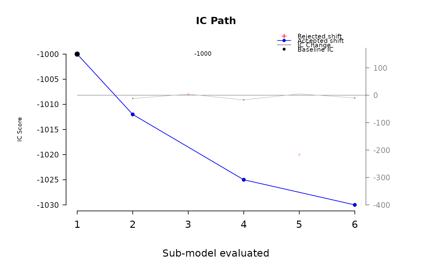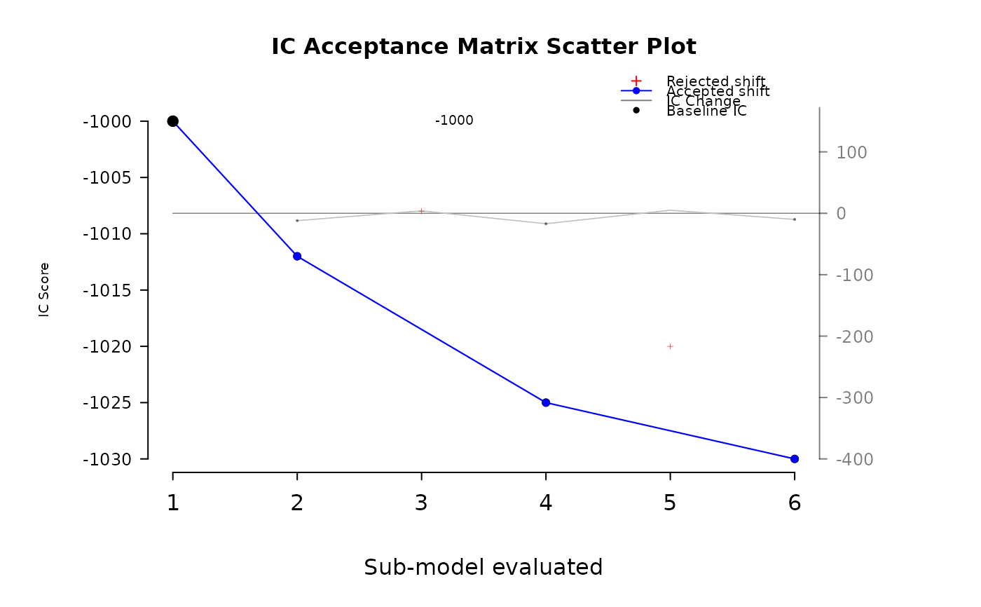plot_ic_acceptance_matrix.RdCreate a two-layer base R plot that visualizes information criterion (IC) scores across a sequence of sub-model evaluations, highlighting which steps were accepted vs rejected. Optionally, a secondary y-axis overlays the rate of improvement (first difference of IC scores) as a line with markers.